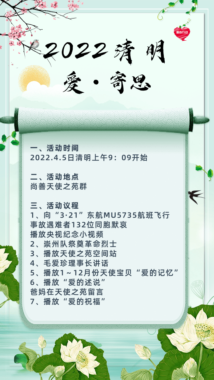 在疫情防控的当下,2022年清明节以线上“云相聚”方式进行,主题为“爱·寄思”。这是第三次清明线上活动,也是暖心行动陪伴大家走过的第七个清明节。非常感谢【尚善暖心】平台上的“天使之苑”版主丁香、家人扬帆远航、梭梭树、缘、木兰策划和制作本次活动,感谢各位版主在各自版块为清明主题默默地付出。