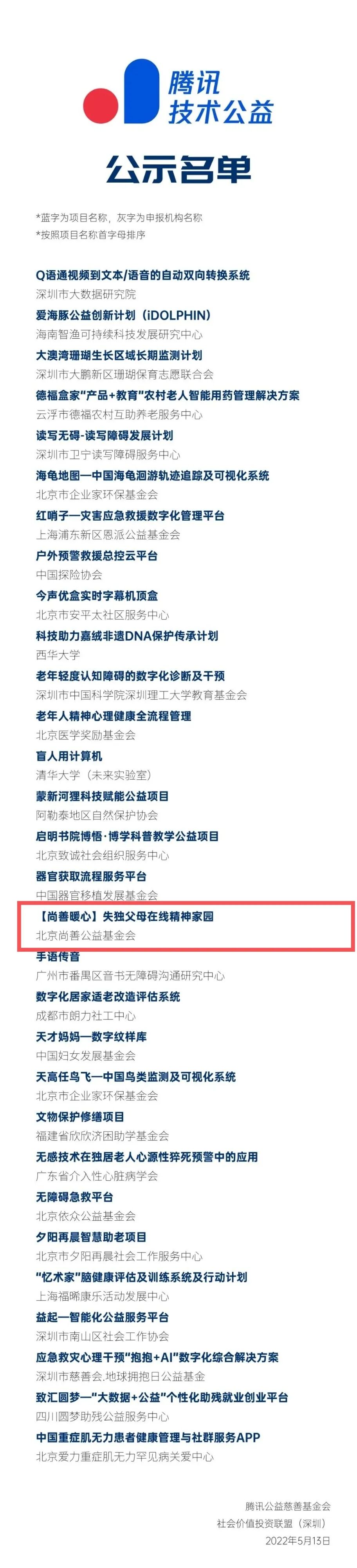 “腾讯技术公益创投计划”(以下简称“本计划”)由腾讯公益慈善基金会发起、社会价值投资联盟(深圳)协办,该计划鼓励社会专业力量通过技术能力应对公益痛点和社会问题,倡导技术公益,希望以公益的技术和创新之力,助力提升运营模式和效能,并通过支持优秀案例,在全社会营造全新、可持续的公益生态空间。