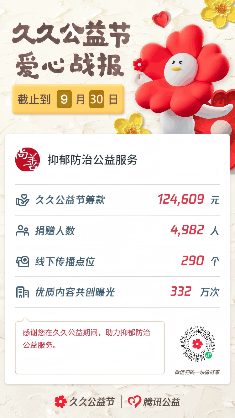 在本次久久公益节中,“长久陪伴”的理念化作无数人的实际行动,爱心暖流持续涌动。截至 9 月 30 日活动结束,尚善公益基金会两大核心项目均收获显著支持,其中“关爱失独暖心行动”作为本次筹款的核心项目,共筹集善款104.37万元,捐赠人数达10388人,成为公众参与度最高、筹款金额最多的项目;“抑郁防治公益服务”同步筹集善款12.46万元,捐赠人数达4982。尚善共获得腾讯激励金12.26万元,今年尚善久久公益节总筹款额达126.09万元。这些善款为两大公益项目落地提供坚实支撑,让每一份善意都精准抵达需要的地方。