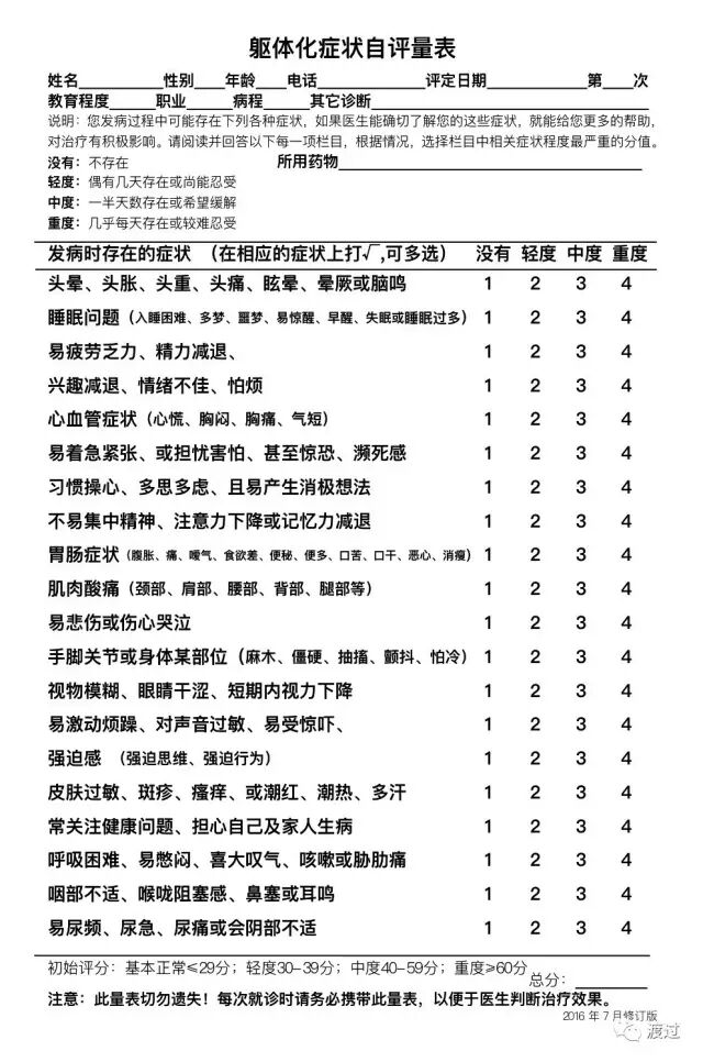 该量表还有助于患者自我管理,充分完成治疗疗程,减少疾病的复发。本量表经研究检验有良好的信度和效度,简单易懂,易被以躯体化症状为主的心理障碍患者所接受,也容易被综合医院非心理专科医生所掌握。