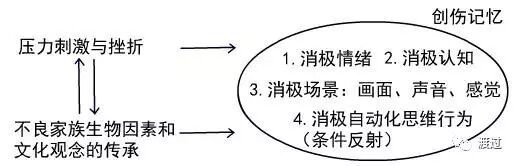 人们遭遇有一定强度的应激事件,可能出现一系列心理、生理、行为上的改变。从记忆的角度看,至少产生四大因素:消极情绪、消极认知、消极场景、消极自动思维行为(条件反射)。它们存储在一个记忆影像里,个体在成长过程中会保存很多这样的创伤记忆,成为人的性格特征的重要组成部分。