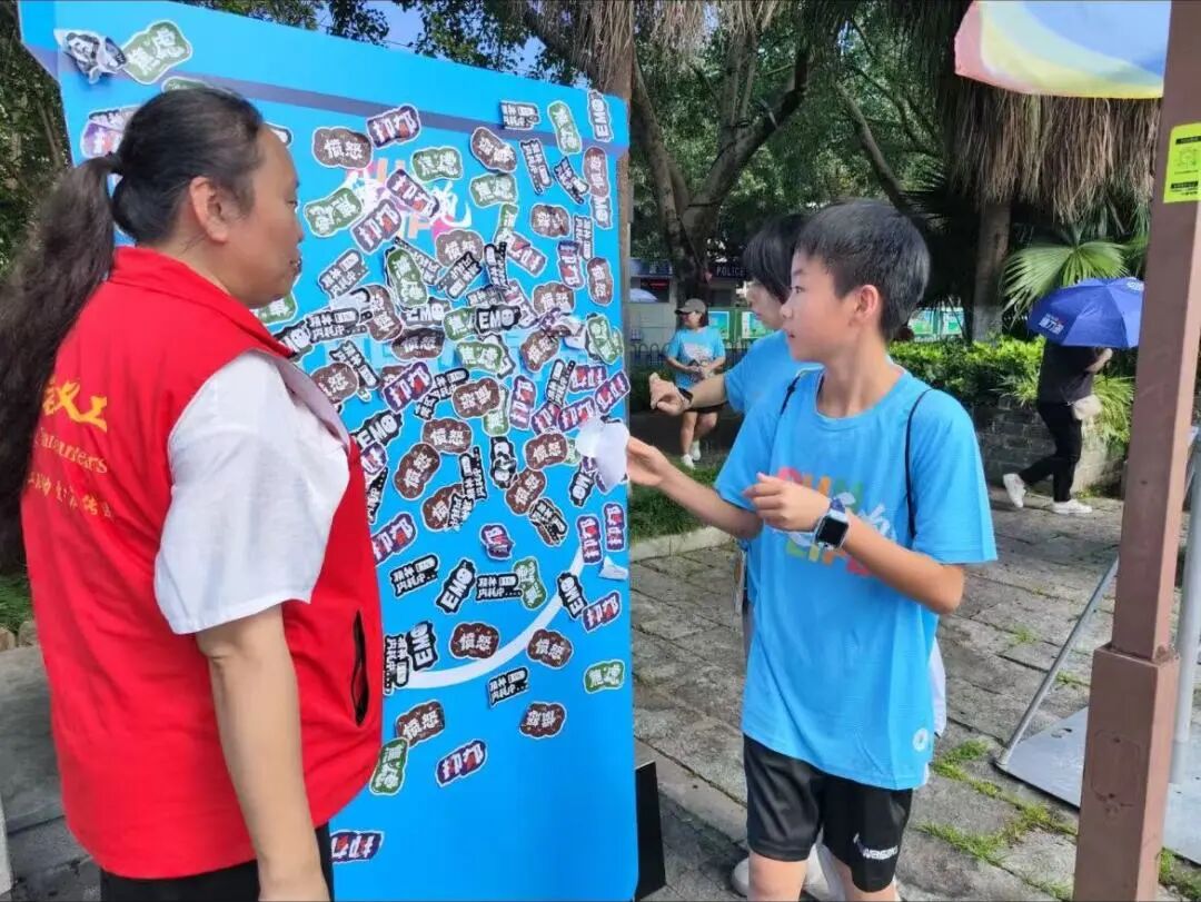 活动将心理健康教育与安全知识科普巧妙融入跑步环节。跑道上沿途特别设置了多个“情绪加油站”,参跑者可将代表焦虑、抑郁等负面情绪的标签撕下,转化为积极能量。终点还设置了心理科普问答,让学生在互动中掌握情绪调节方法。