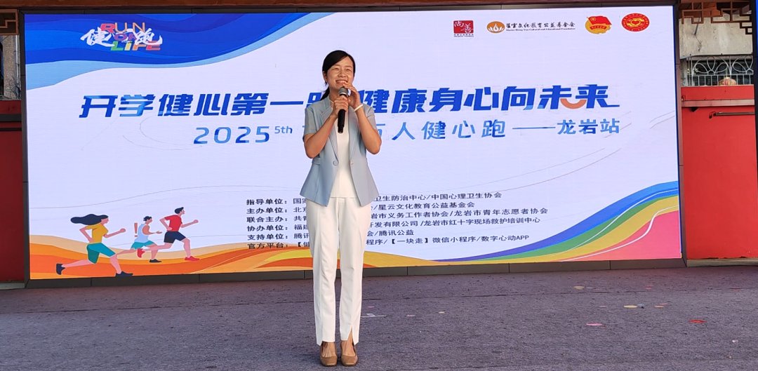 共青团龙岩市委副书记李意在发言中表示:“本次‘健心跑’活动是暑期‘急救小飞侠’项目的配套延伸,旨在通过运动的方式帮助家长和孩子缓解压力与焦虑,迎接新学期。希望孩子们能够甩掉身上的烦恼,做快乐的学生。”她还介绍了团市委在青少年心理健康服务方面的多项举措,包括线下12355青少年服务台、市行政服务中心的心理咨询窗口。“我们积极整合社会资源,持续完善心理健康服务体系,也欢迎更多像北京尚善公益基金会这样的组织与我们携手,共同守护青少年的健康成长。”