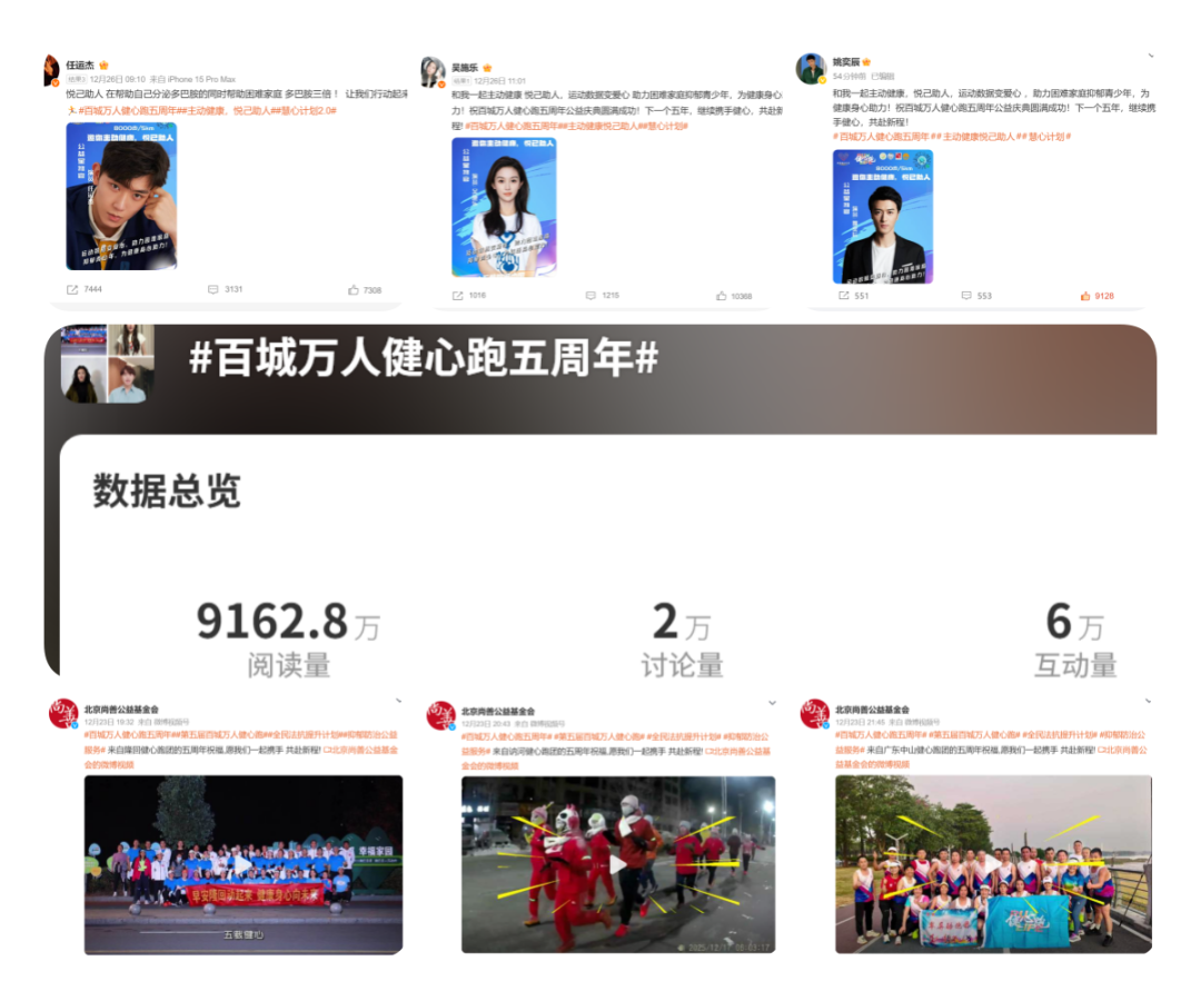 与此同时,来自全国数十个城市的健心跑团队纷纷录制五周年祝福视频,用真诚的话语传递对健心跑的热爱与期许。一支支团队的温情助力,让“百城万人健心跑五周年”话题持续升温,成为全民热议的公益焦点。截至12月31日,该话题热度高达9162万,无数网友通过点赞、转发、评论的方式,加入到健心公益的传播阵营中。