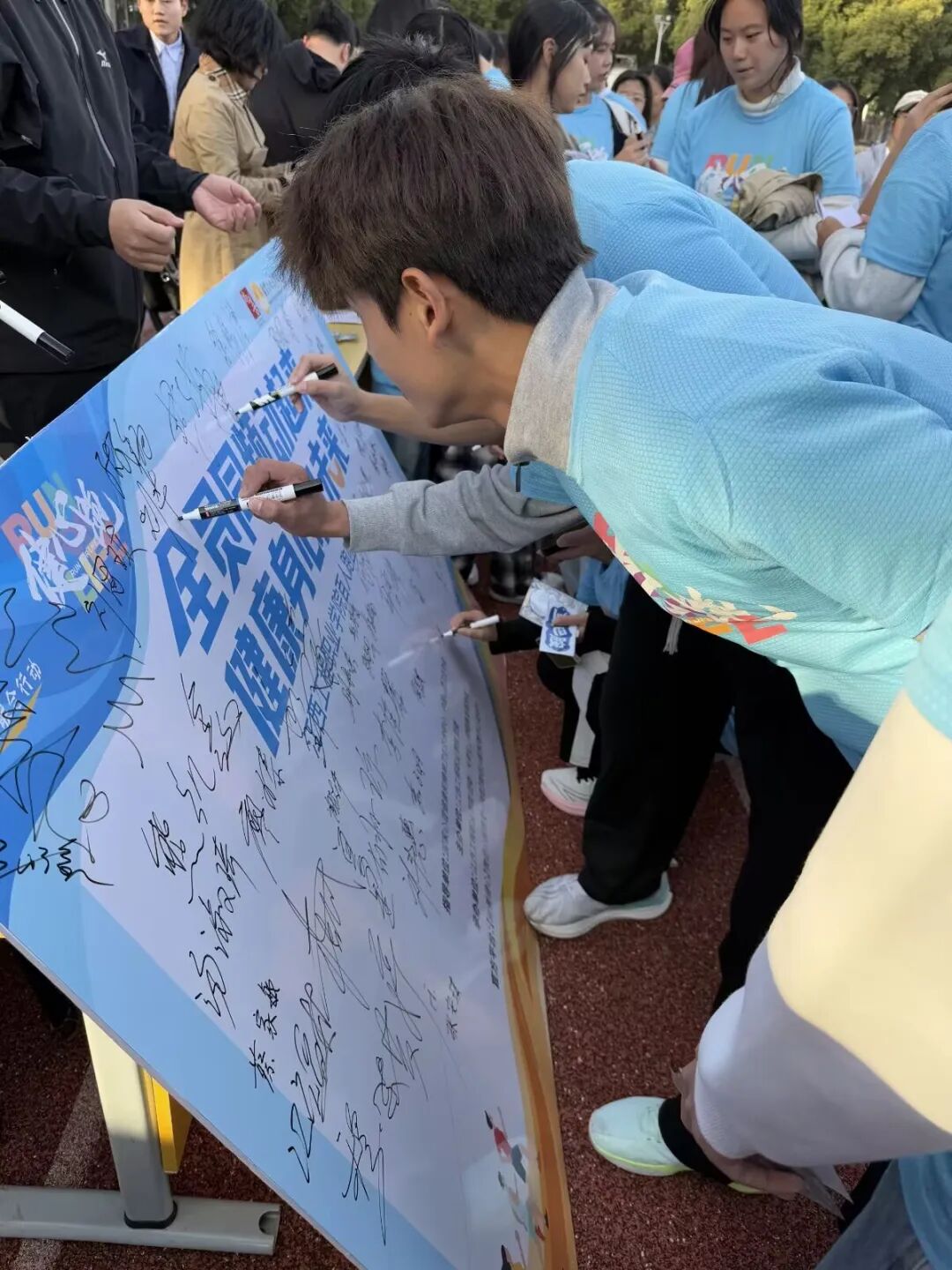 于是,“百人跑团”的构想应运而生。这并非一时兴起,而是“成己达人”信念的驱使——自己受益,便渴望更多人同行。我的想法得到了北京尚善公益基金会和学校团委的大力支持。从策划到动员,从筹备到落地,2025年11月27日,江西工程职业学院首届“百人跑团”启动仪式在深秋的暖阳中热烈举行。看着学生们奔跑时飞扬的青春、签名时灿烂的笑脸,我知道,这一切的价值已无需多言。这不再是简单的跑步,而是一场关于自我发现、集体凝聚和身心健康的生动实践。