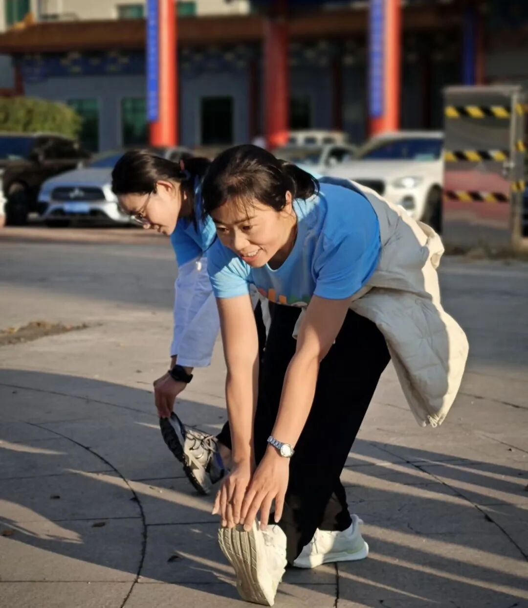 我看见三五身影,身着统一的蓝色短袖,胸前“健心跑”三个字格外醒目。他们步履轻快,谈笑风生,像一道流动的风景。惊喜之下,我上前询问,果然是一个可以加入的集体!尚未办理入住的我,拖着行李箱便冲进卫生间,换上从南昌带来的运动装备,再将崭新的“健心跑”运动衫套在外面。一套行云流水的操作后,我将行李箱寄存在前台,转身汇入了那片蓝色的海洋。