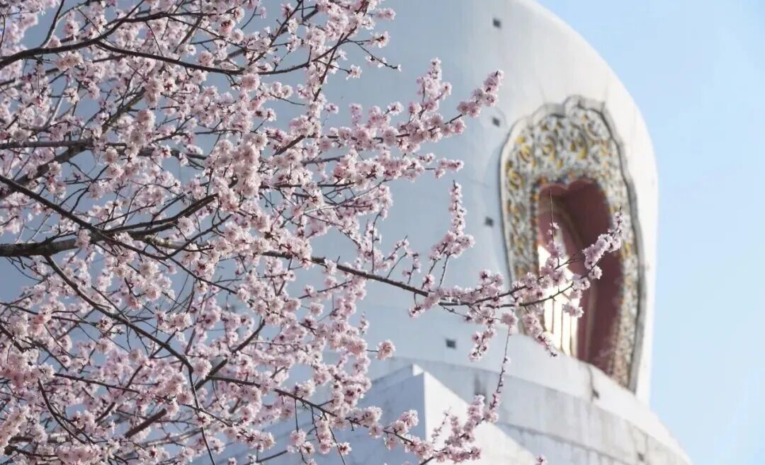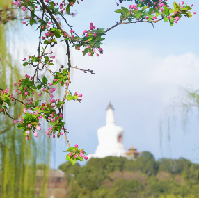 3月的北海公园刚刚迎来了动人的时节,山桃缀满枝头,粉白花瓣映衬着巍峨白塔,红墙嫩柳与澄澈湖水相映成趣。